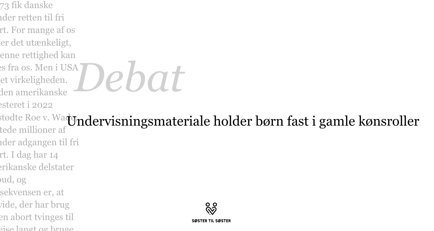 Efter længere tids indsigt i Søster til Søsters arbejde med køn og ligestilling står det klart for mig, hvor gennemgribende kønsnormativt store dele af undervisningsmaterialet i den danske folkeskole stadigt er. En af de første gange jeg blev bevidst om denne problematik var, da Søster Til Søster udgav et vidnesbyrd fra en dansklærer som var blevet noget chokeret over det undervisningsmateriale hun var blevet stukket i hånden.