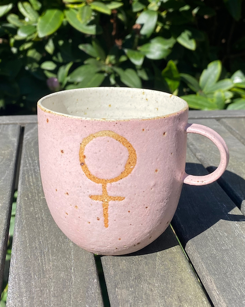 Keramikkop med et kvindesymbol, lavet i samarbejde med Anna Bystrup Keramik.