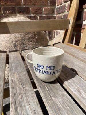 Hver eneste kop er hånddrejet af Anna i hendes hyggelige værksted, så du får et unikt stykke håndværk mellem hænderne. Som prikken over i’et har hun i frihånd skrevet budskabet “Ned med patriarkatet” i blå, så din kaffe eller te automatisk smager lidt mere revolutionært.