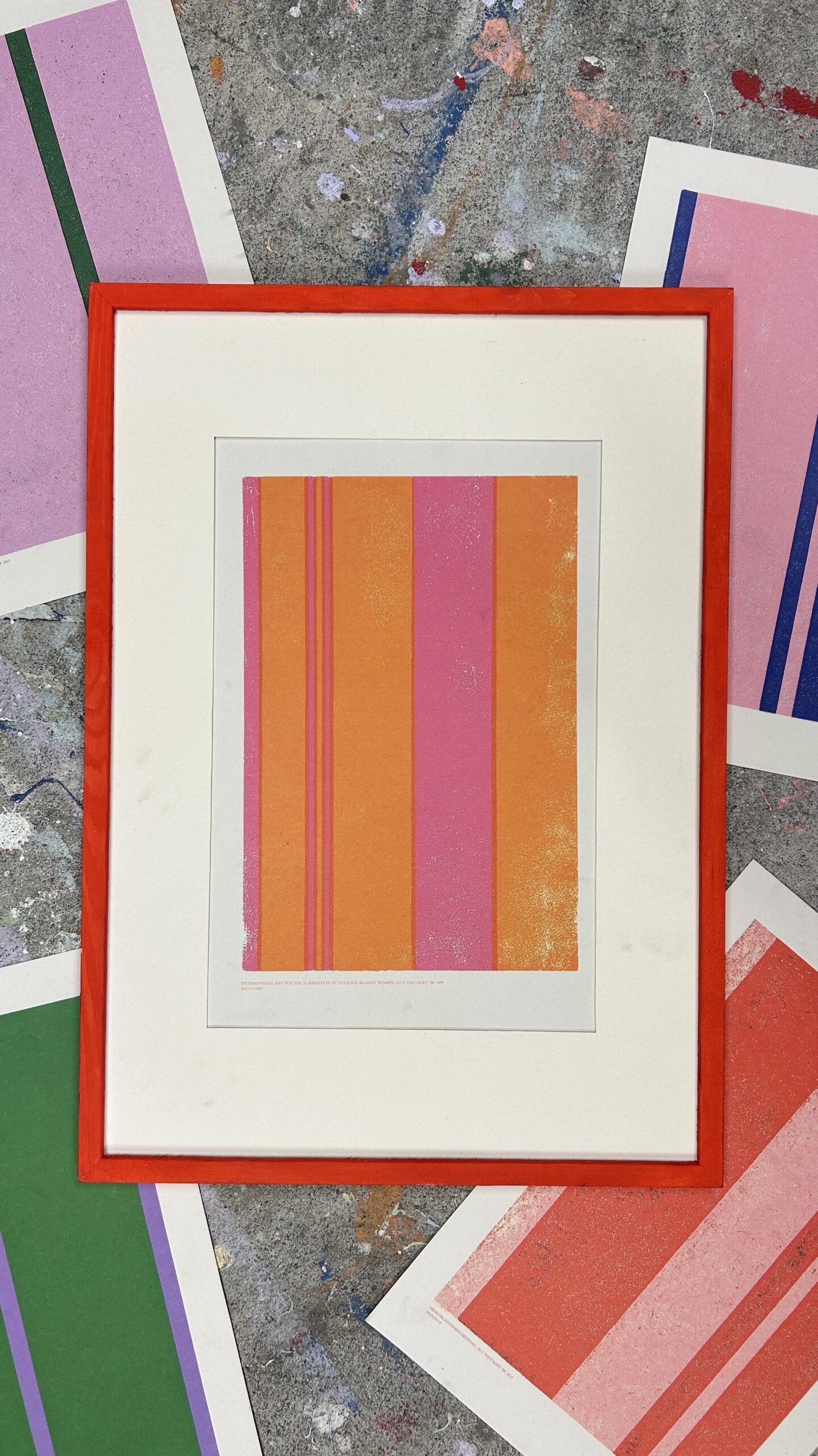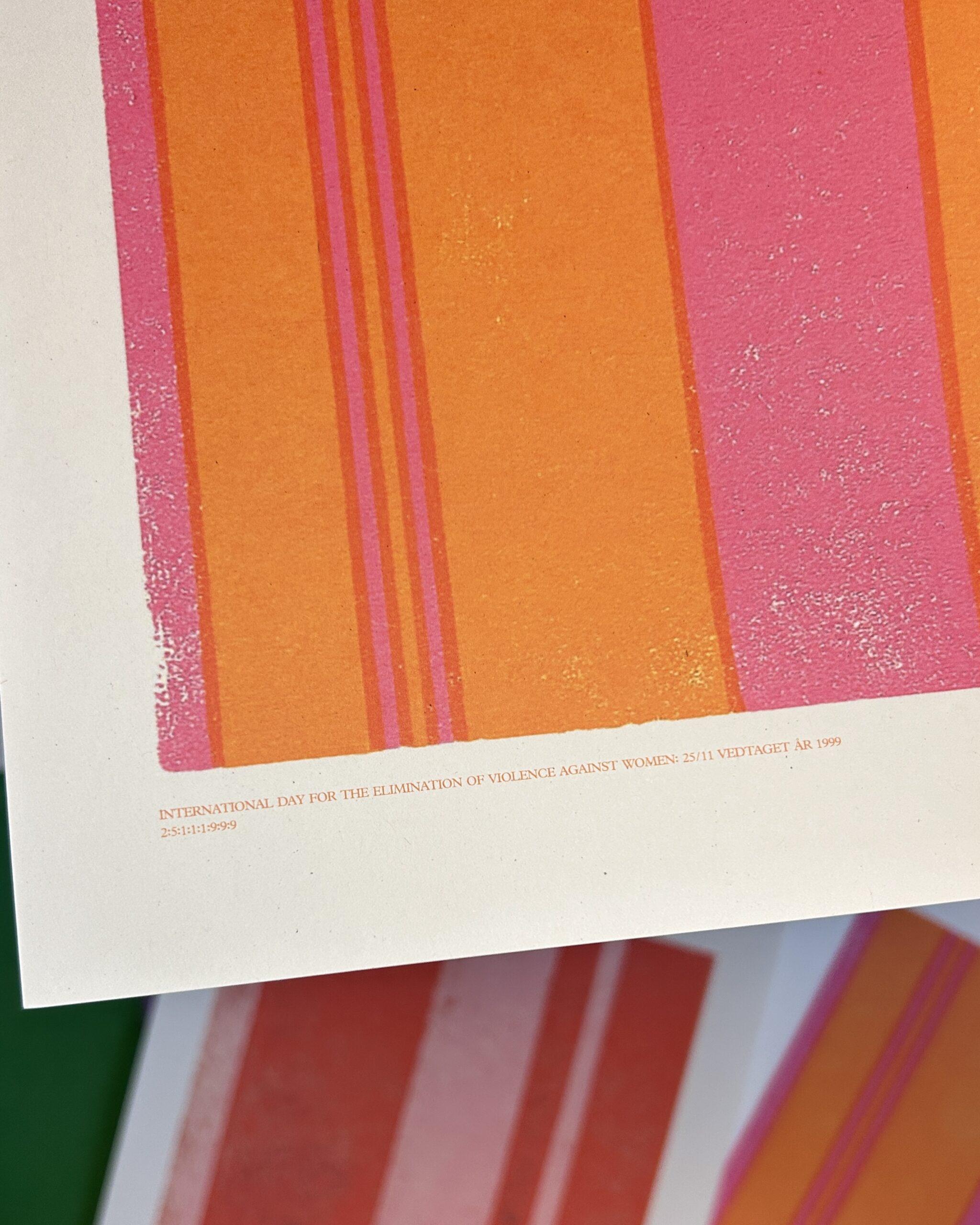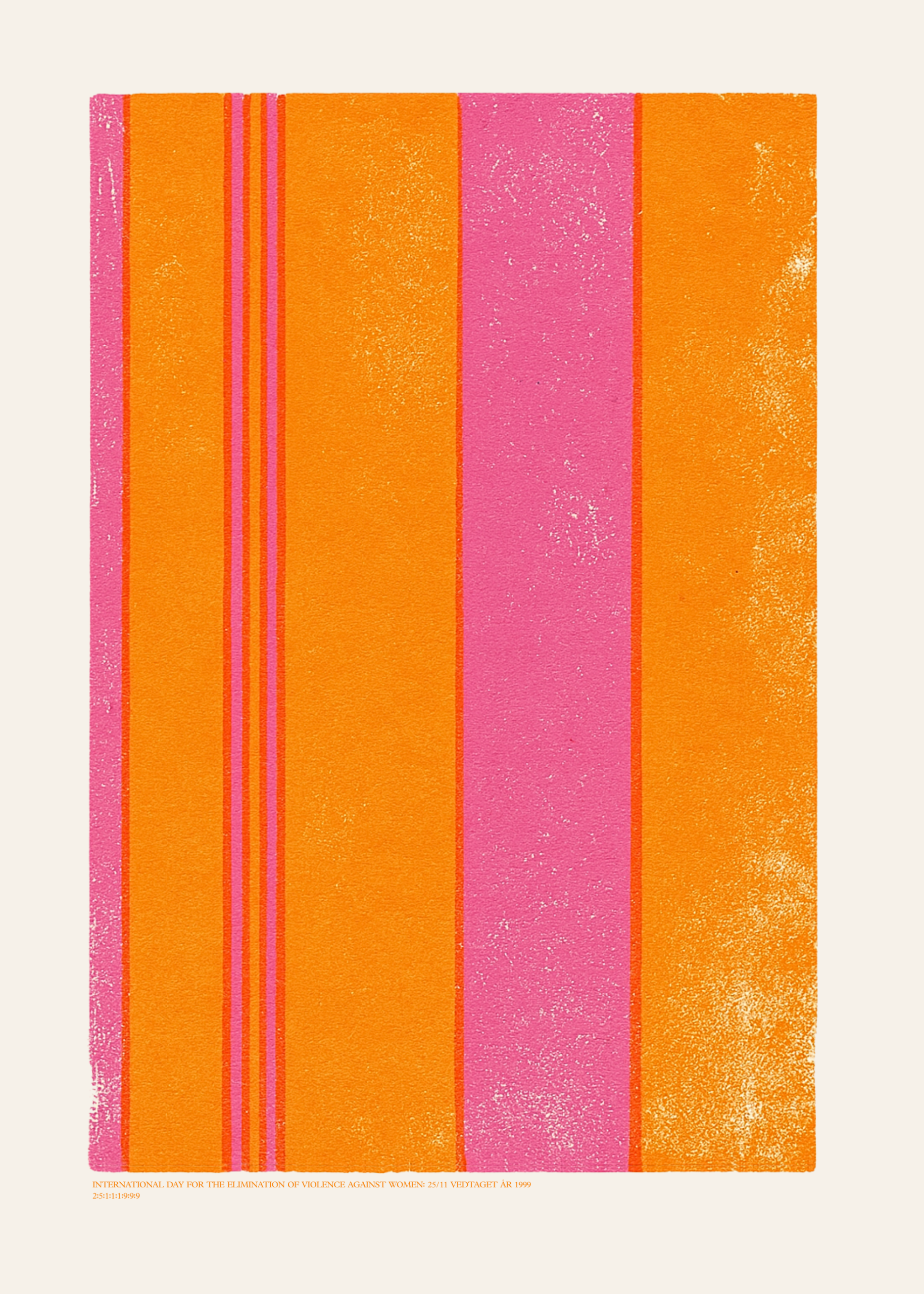 En plakat til dig, der nægter at vende blikket væk. Som insisterer på, at kærlighed aldrig må gøre ondt, og at tryghed ikke skal være et privilegium, men en selvfølge. Striberne følger proportionerne 2:5:1:1:1:9:9:9. En visuel kode for datoen 25/11/1999.