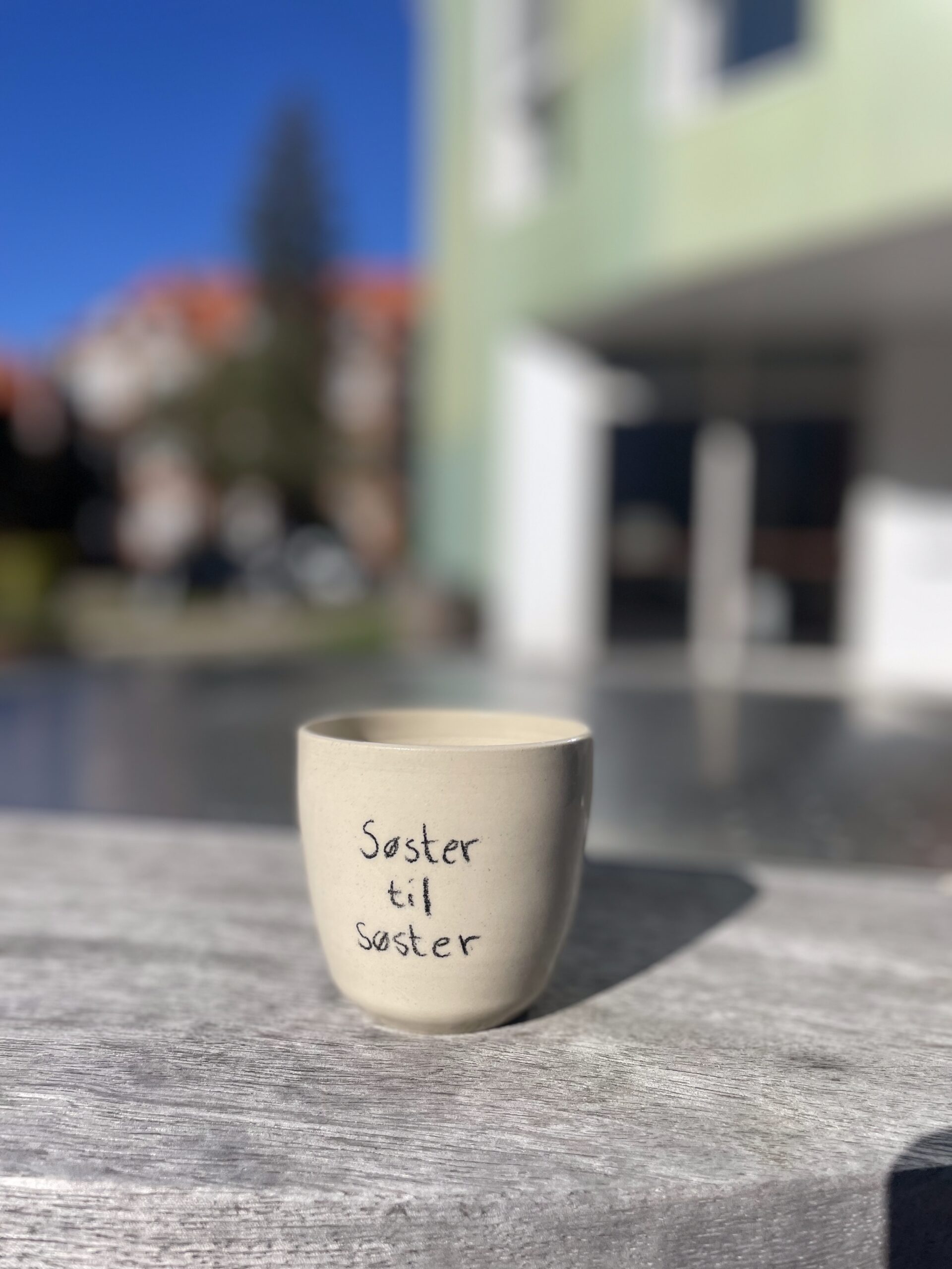 Håndlavet keramikkop fra Formfast i Aarhus. Med teksten “Søster til Søster” er den både din nye yndlingskop og en hyldest til vores fællesskab.